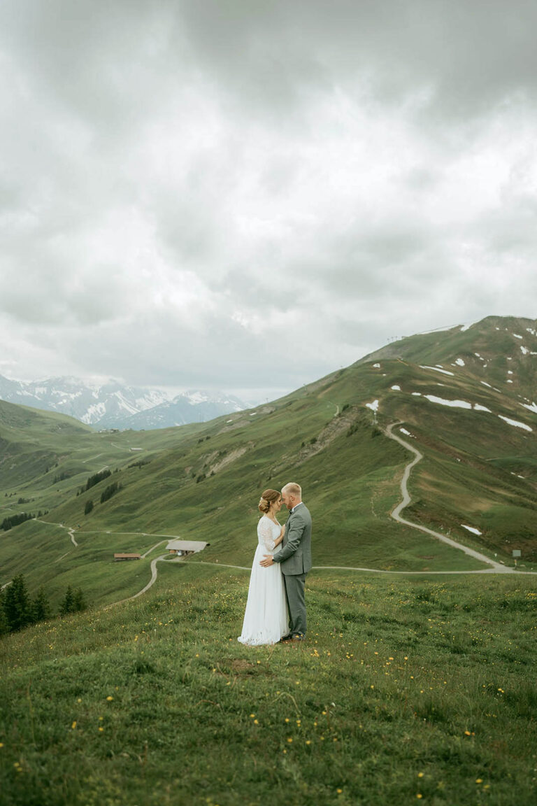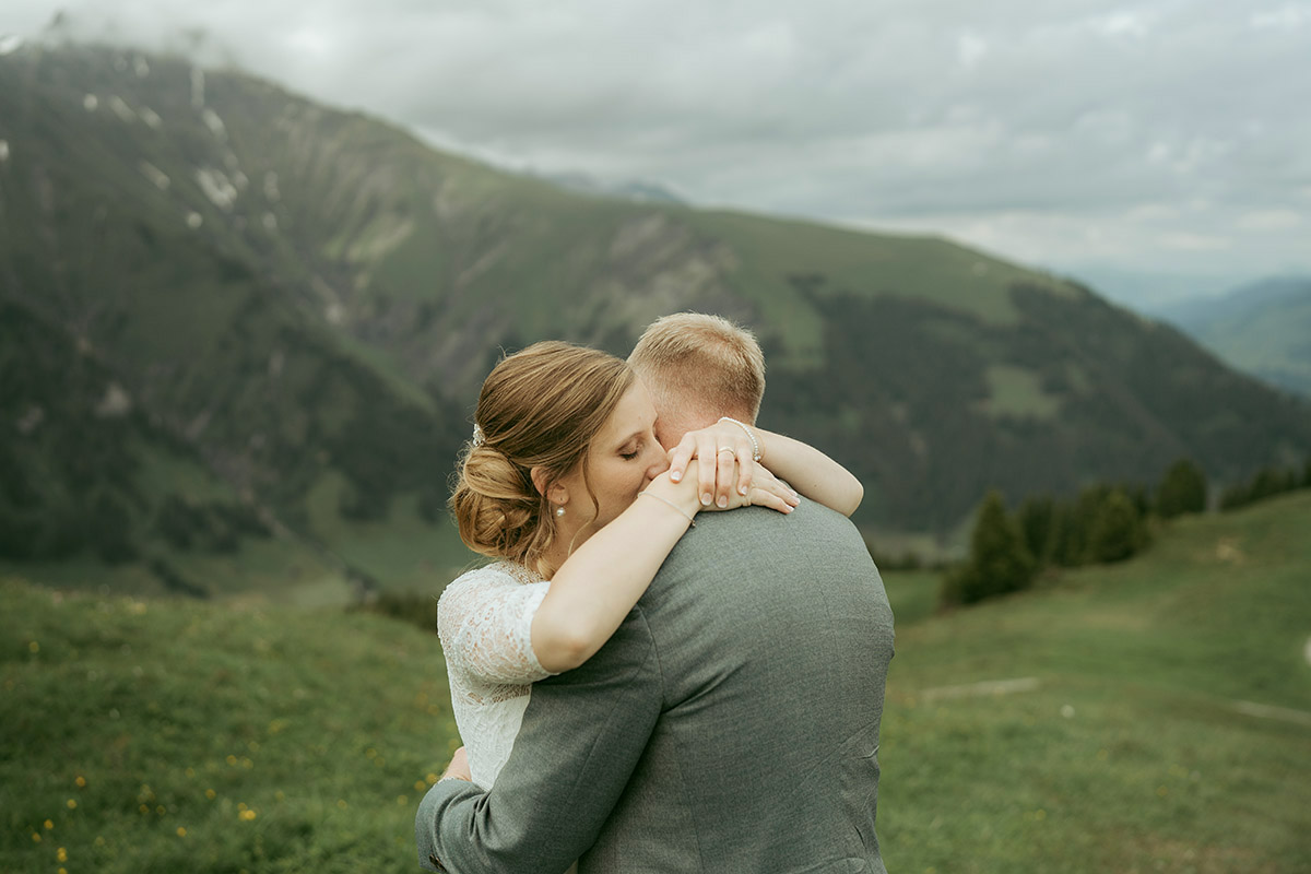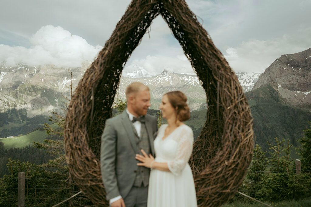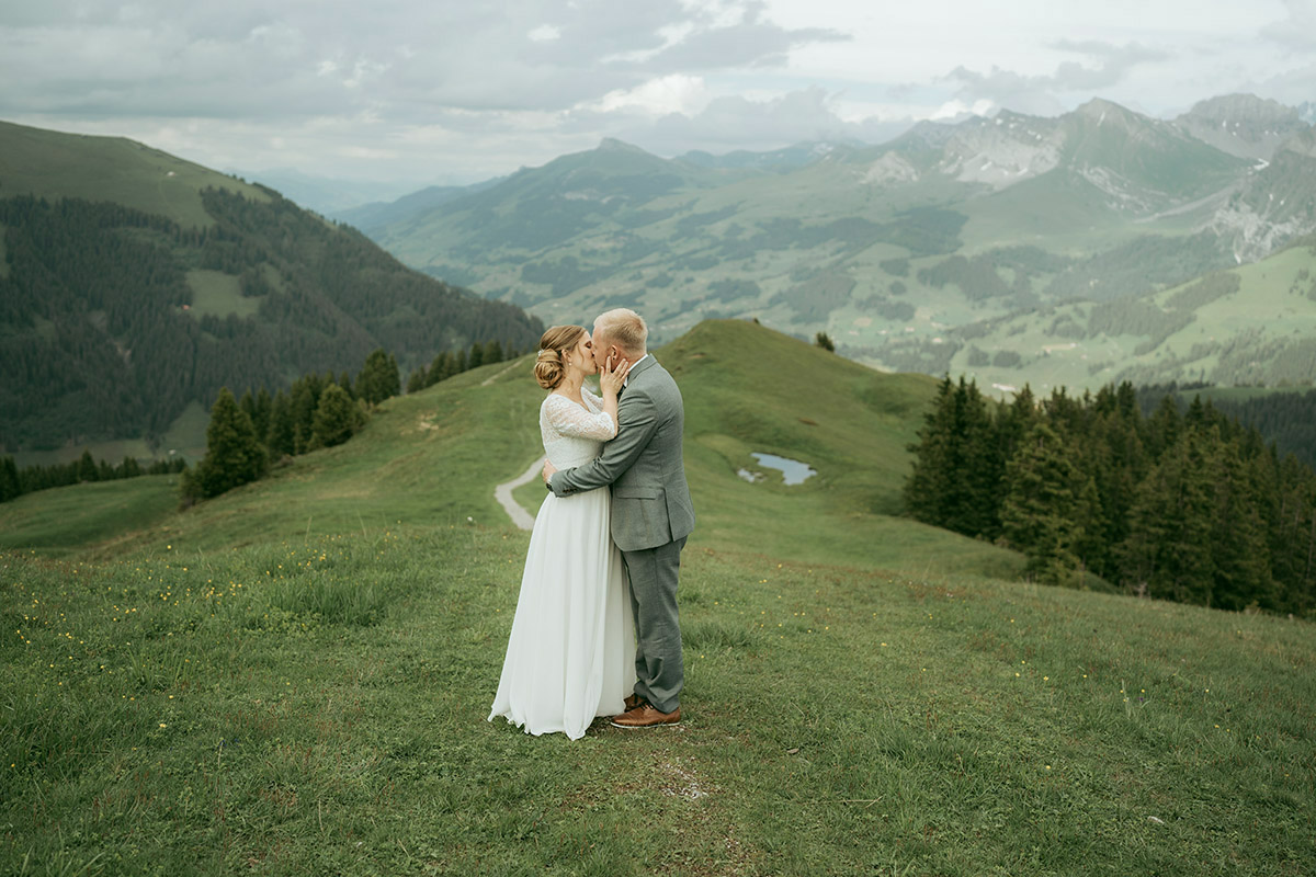 Ein ganz besonderer Höhepunkt war zweifellos das persönliche Trauversprechen, das sie sich gaben – ganz alleine, fernab von allem Trubel, in der beeindruckenden Kulisse der Schweizer Alpen. Die Berge, die frische Luft und die friedliche Stille schufen die perfekte Atmosphäre für diesen besonderen Moment.