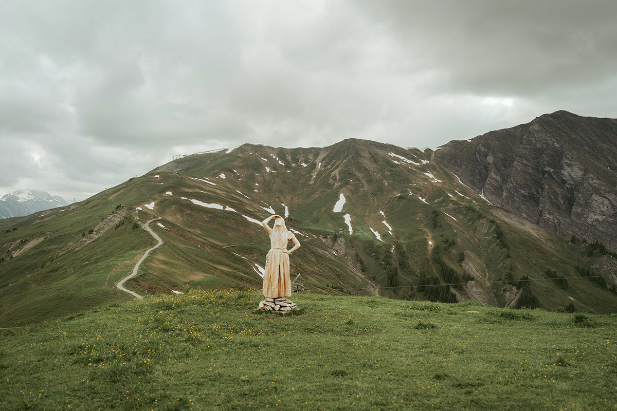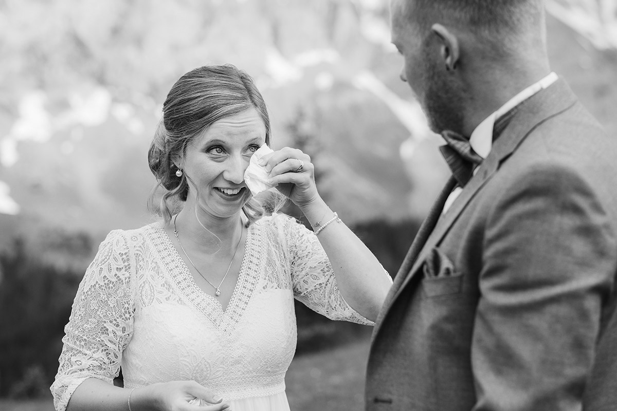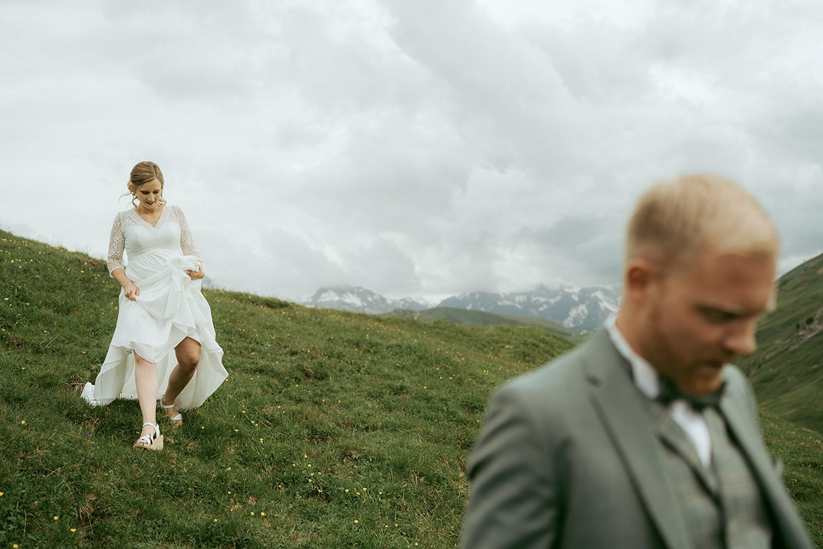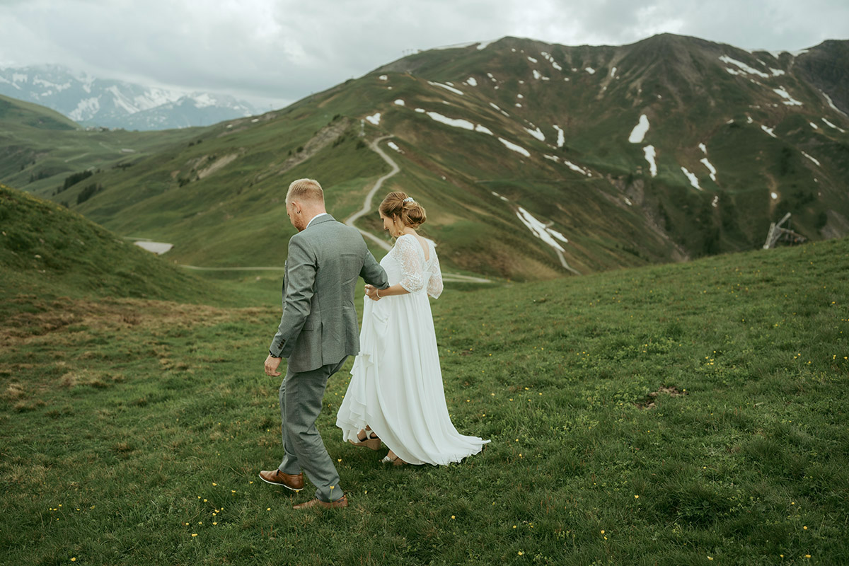 Ein ganz besonderer Höhepunkt war zweifellos das persönliche Trauversprechen, das sie sich gaben – ganz alleine, fernab von allem Trubel, in der beeindruckenden Kulisse der Schweizer Alpen. Die Berge, die frische Luft und die friedliche Stille schufen die perfekte Atmosphäre für diesen besonderen Moment.
